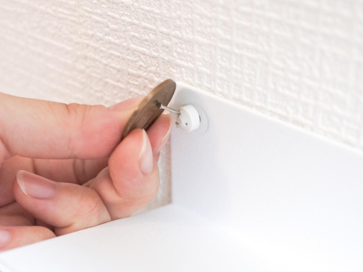 壁に取り付ける時は、1カ所あたり3つの石こうボードピンをコインで打ち込んでいきます。
