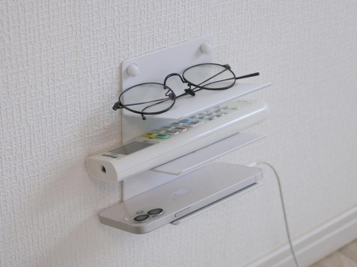 山崎実業のこれのおかげで、充電中のスマホ、メガネ、リモコン、本……と、ベッドサイドで散らかるものをスッキリ整頓でききました!
