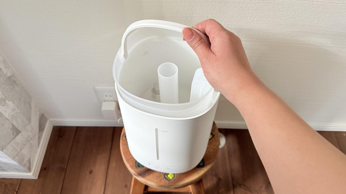 水を満タンにしてもタンク単体なので重すぎず、注ぎ口も広め。水をこぼしにくく、給水時の気遣いがほとんど不要です。タンクに取っ手がついているのもいい感じ。「加湿器=給水が面倒」という印象が、この一点でかなり変わりました。