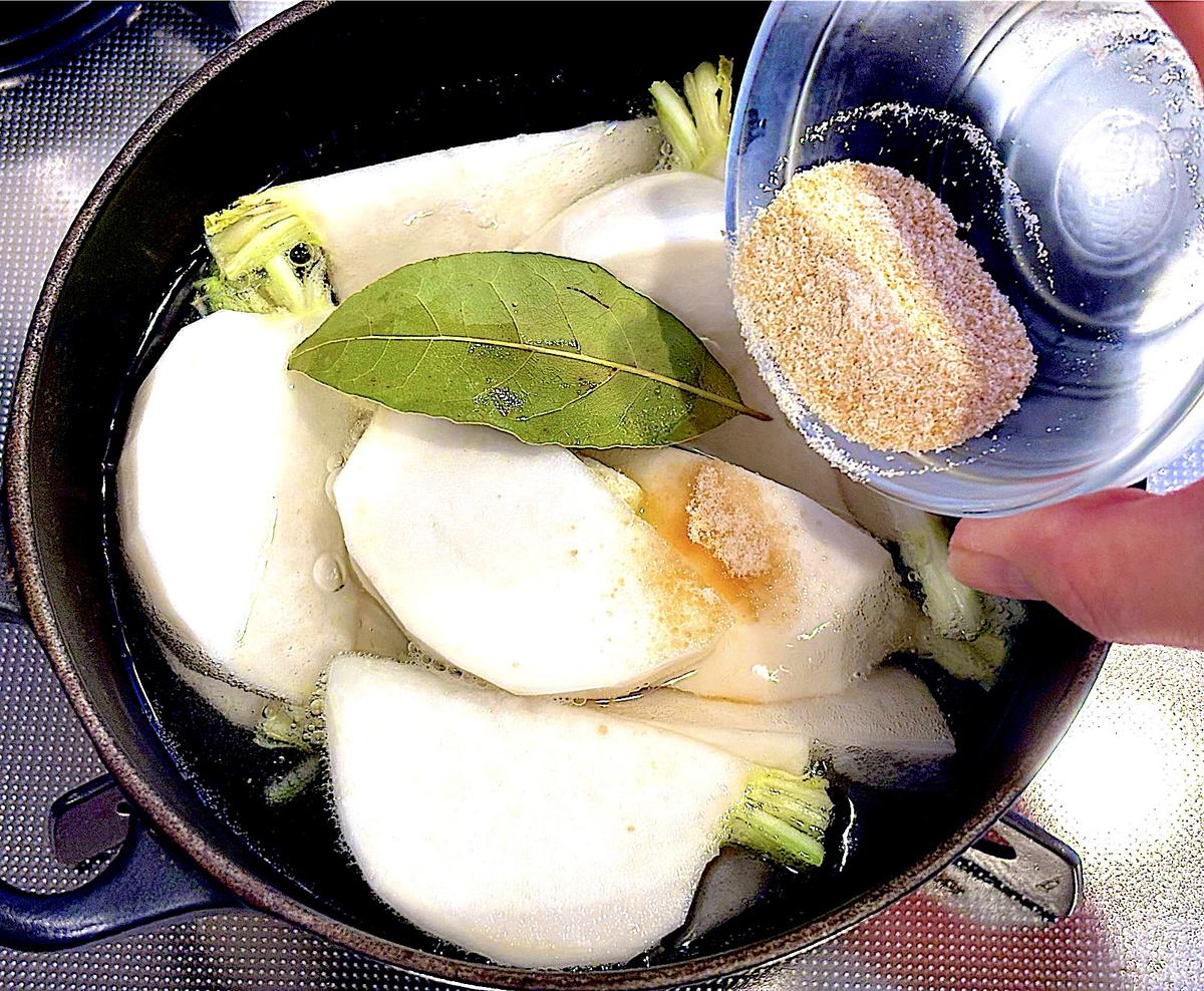 3. 煮立ったらバターと塩を加えて調味する。かぶが透き通って柔らかくなるまで煮る。