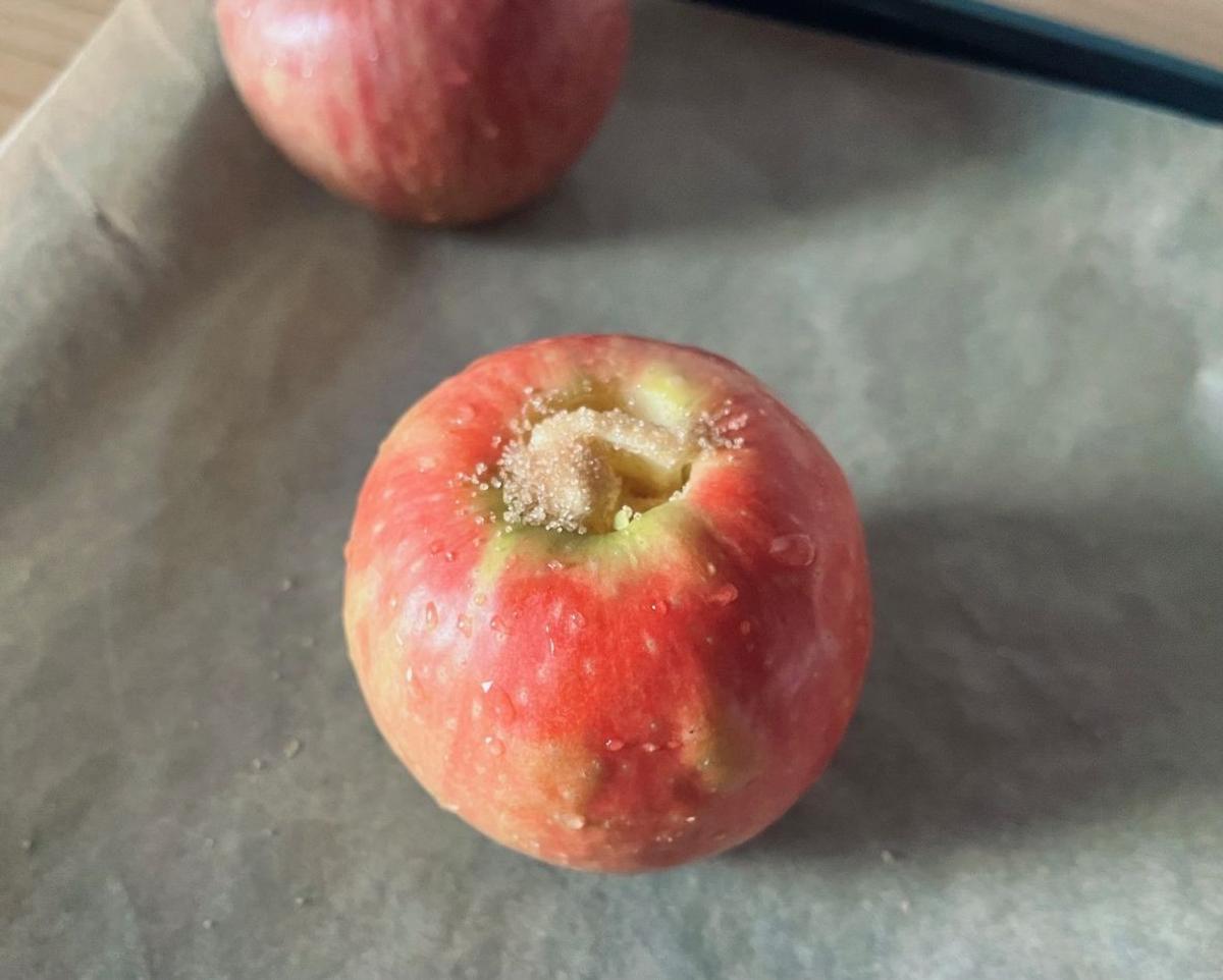 きれいに空いた穴の中に砂糖大さじ1と入るだけのバターを詰め、200℃のオーブンで20分焼けば、えもいえないおいしさの焼きりんごの完成です。