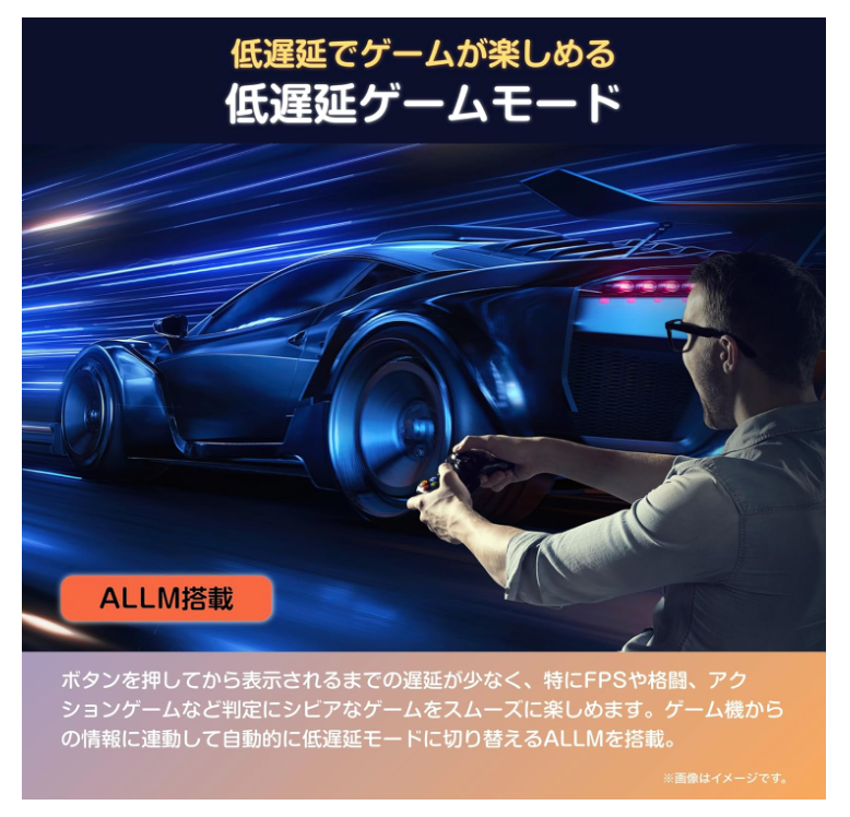 ALLM対応の低遅延ゲームモードにより、SwitchやPS系ゲーム機でも操作のタイムラグが少なく快適にプレイできます。