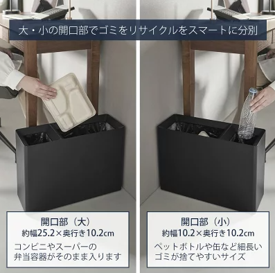 2つの投入口(大・小)が付いた2分別タイプで、可燃ゴミとプラスチック(またはビン・カン)などを分けて捨てられる便利な構造になっています。