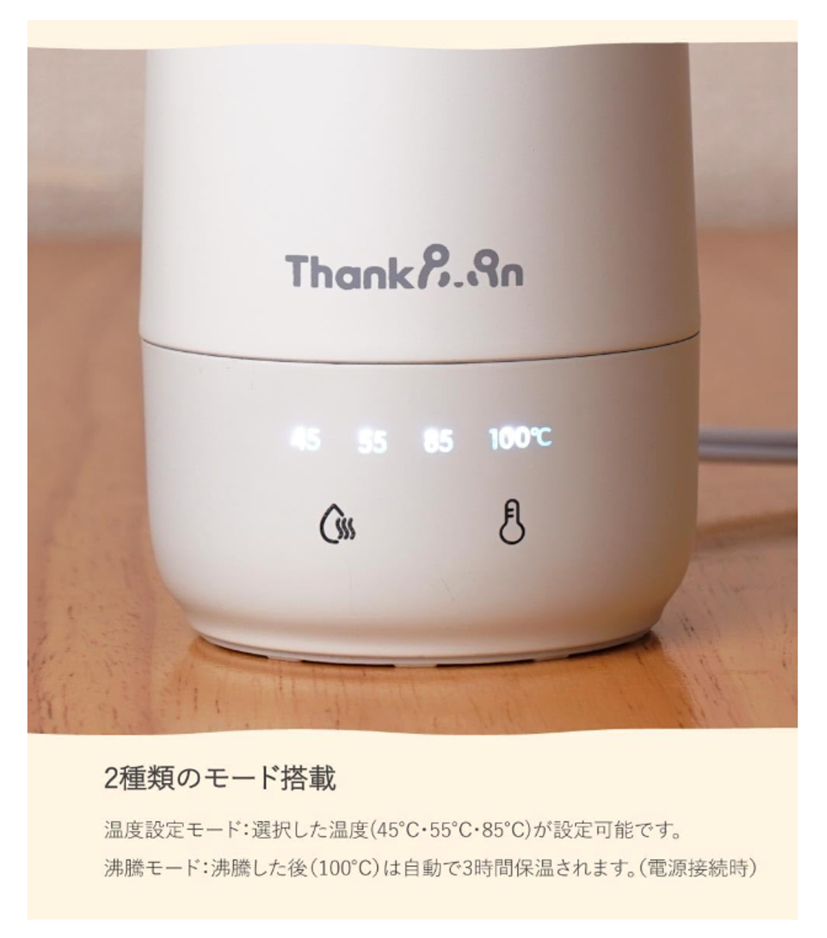 温度設定モードでは45℃・55℃・85℃に調整ができ、白湯用やホットドリンク用まで好みの温度で沸かせるのが嬉しいポイントです。