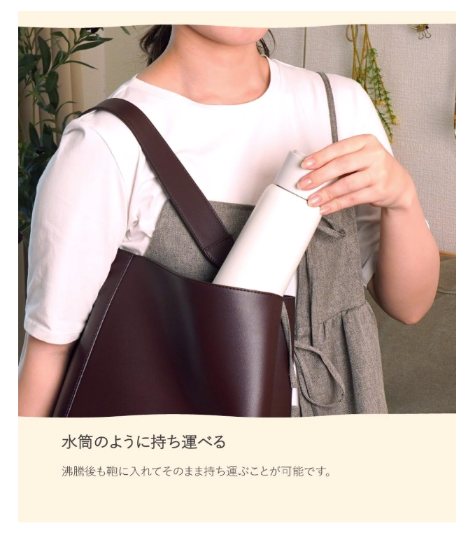 見た目はまさに水筒スタイルで、沸騰後も蓋を閉めたままバッグなどに入れて持ち運べるのが最大の魅力。オフィスでも使いやすく、プチ外出のお供にも◎です。