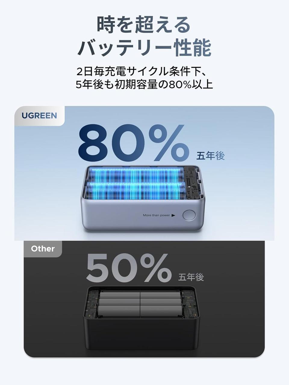 優れたバッテリー性能を備えており、5年後でも初期容量の80%を維持できます。長く愛用できるモバイルバッテリー、おすすめです。