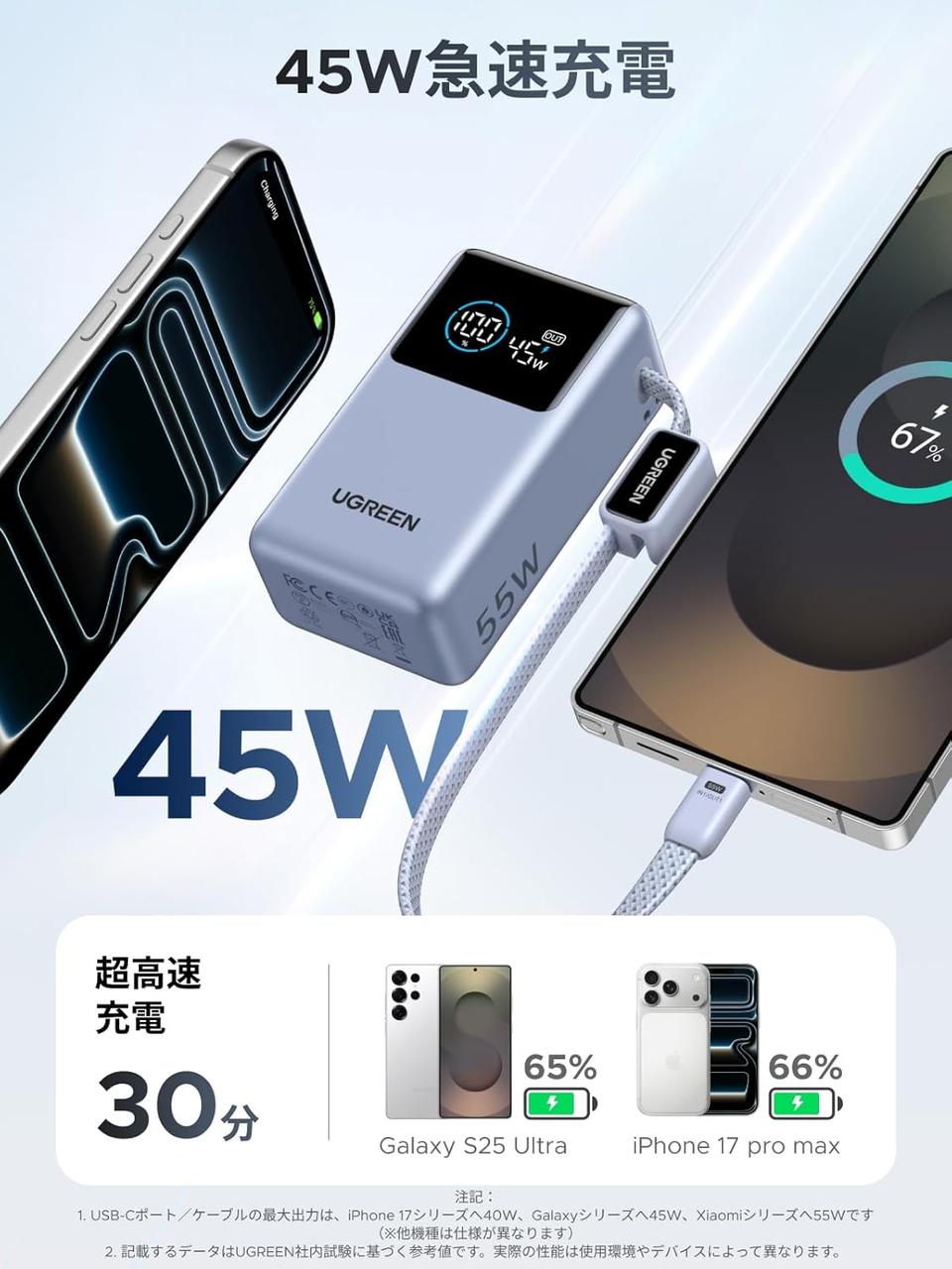 UGREENのモバイルバッテリー「PB727」が4,541円で販売中。USB-Cケーブル一体型ですぐに充電できます