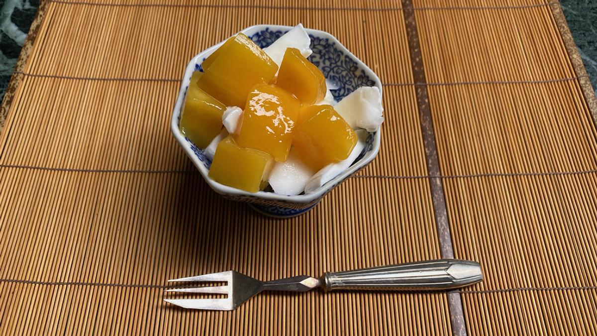 缶詰のマンゴーとブルガリア・ヨーグルト・アイス。サラサラと粉雪がふりはじめました。