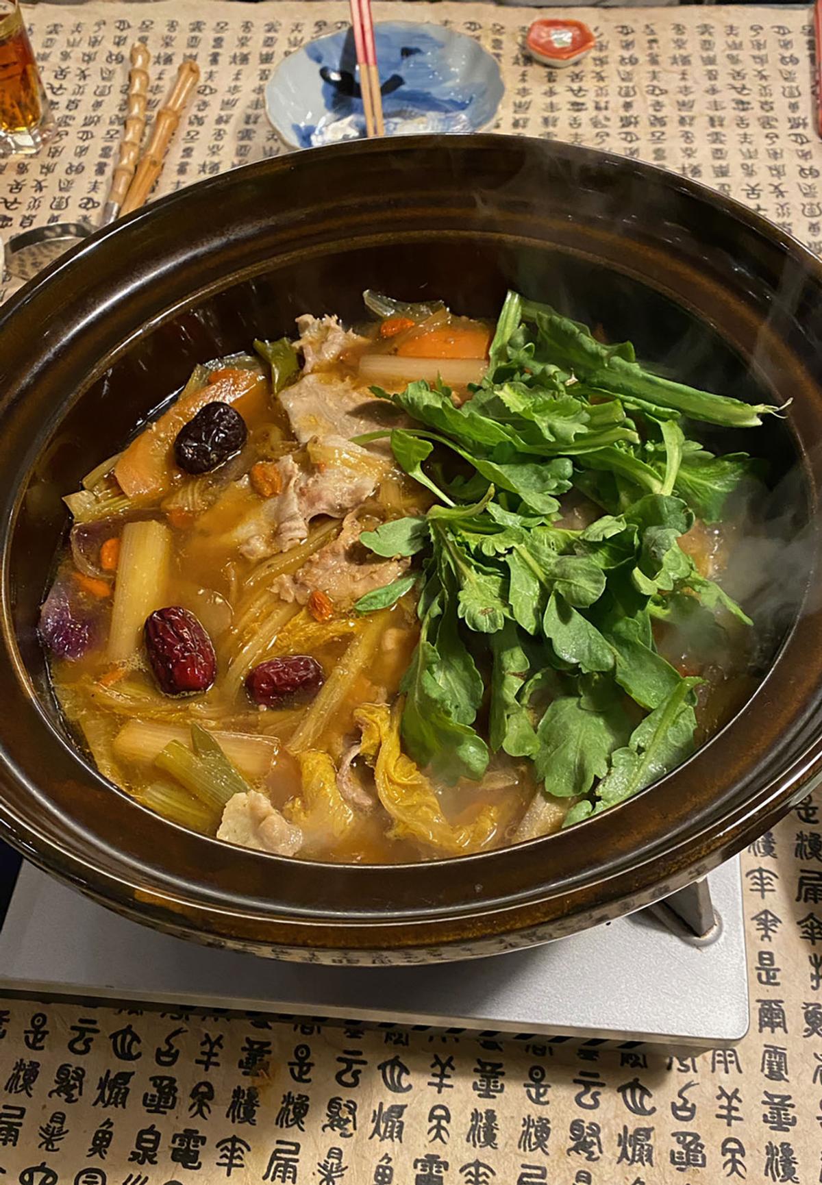 先日いただいた中国土産の「青花山椒」「花椒」に登場のチャンスが到来! 棗(ナツメ)、クコの実、八角、赤唐辛子は手持ちの材料。他に水、醤油、鶏ガラスープの素、白だし、酒を入れて基本スープを作る。味見する。カッ辛~い!と愕然。にんじん、白菜、セロリ、牛蒡など、中途半端に残っている野菜をスープに投入して煮る。豚バラ肉も投入。