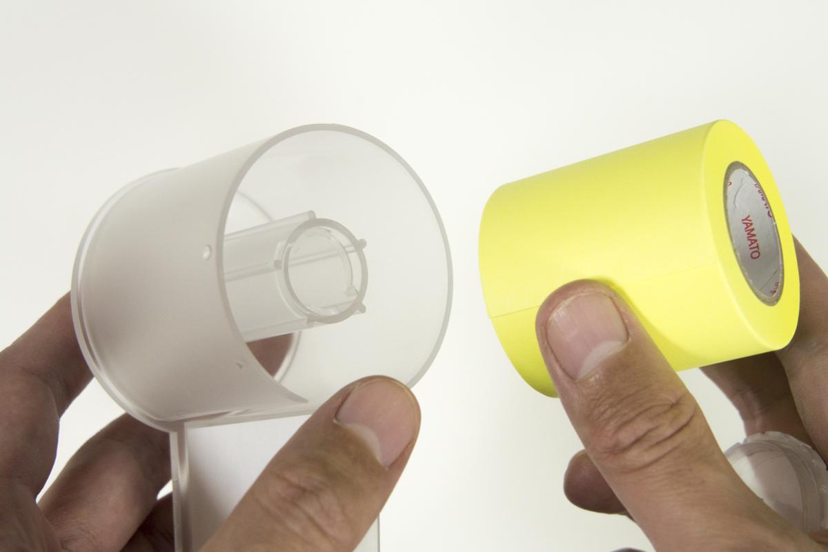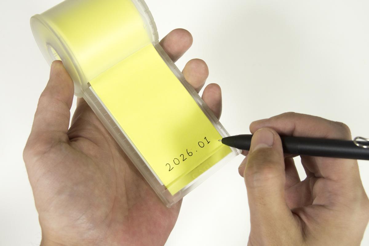 手持ちで立ったまま、切る前に書き込める今までにない形の「ロールふせんホルダー」。