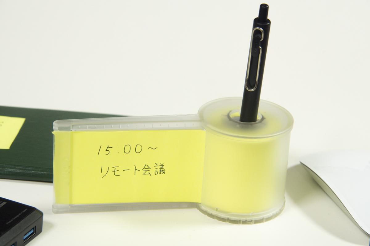 板部分のおかげで、手持ちで立ったままメモなどを書き込むことができるのが、このロール付箋ホルダーの大きな特徴。