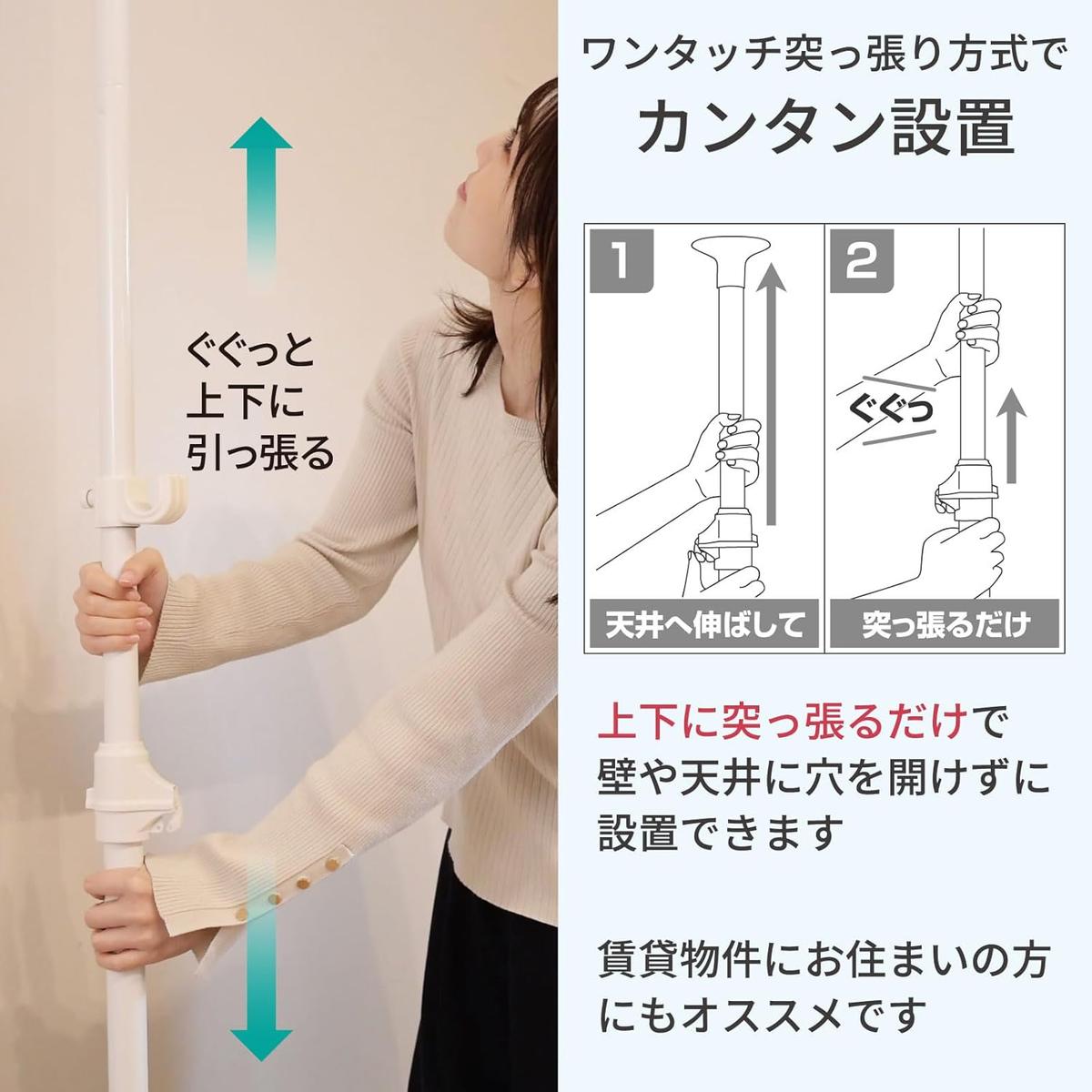 ハンガー掛け降ろし棒が付属し、高所の衣類も踏み台なしでかけ外しできます。高さ調節はゴムリング方式のため、ポールを傷つけにくいのもポイント。縦のスペースを存分に使いこなせて、なおかつ頑丈なのがうれしいですよね。