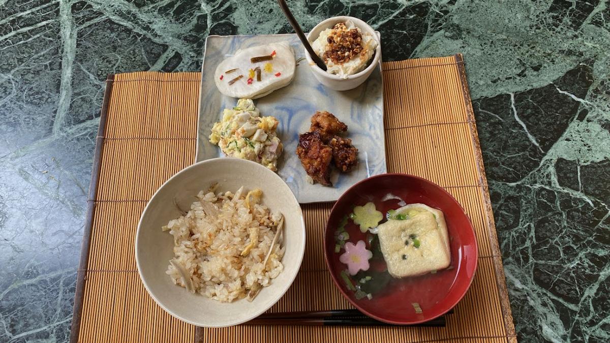 牛蒡と油揚げの炊き込みご飯、お麩のお吸い物、千枚漬け、ポテトサラダ、豆腐(サクサクアーモンド醤油/キッコーマン)、鶏肉の唐揚げ。オホホ、昨夜の残り物でございました。