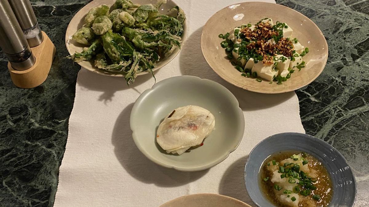 天ぷら(ふきのとう、プンタレッレ)、豆腐(サクサクアーモンド醤油&小ネギ)、千枚漬け。