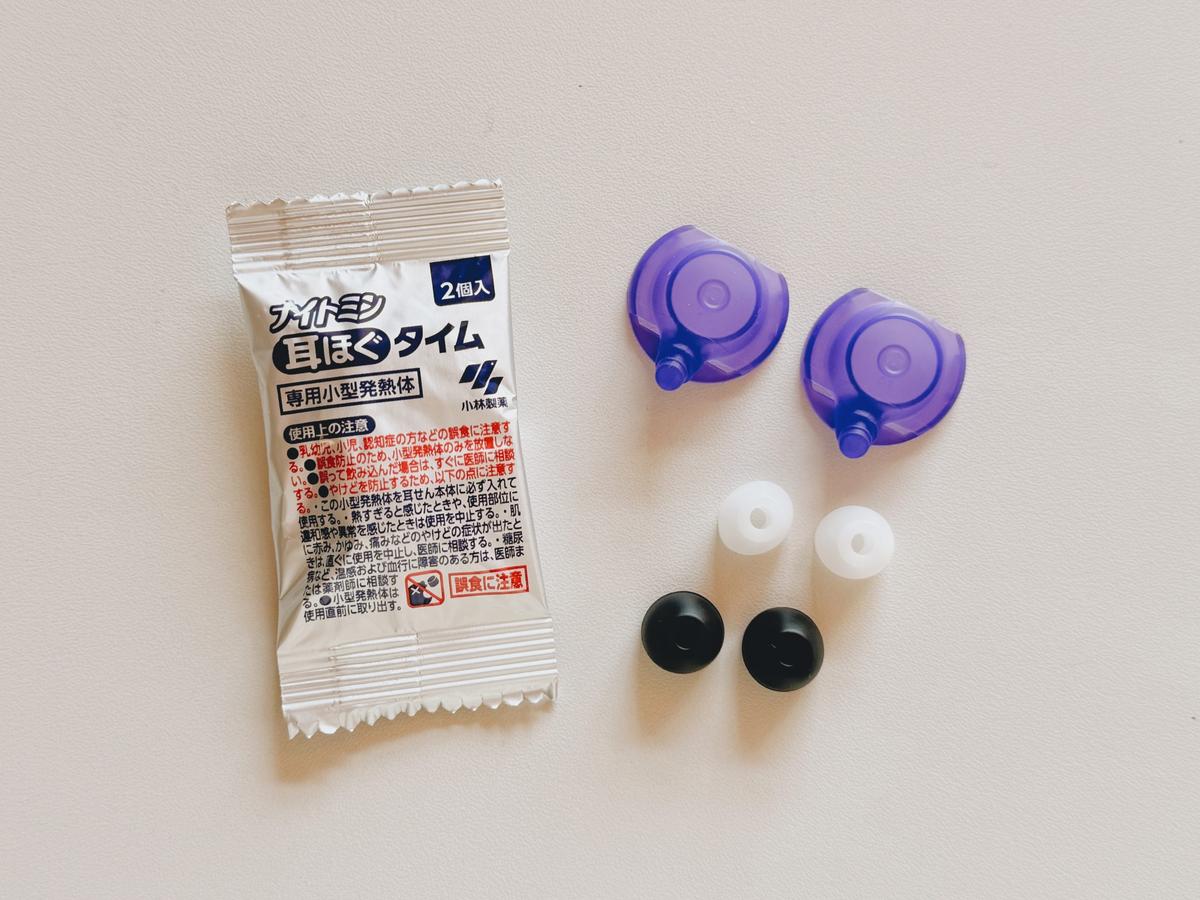 パッケージの中には、本体とイヤーピース、発熱体が5セット。