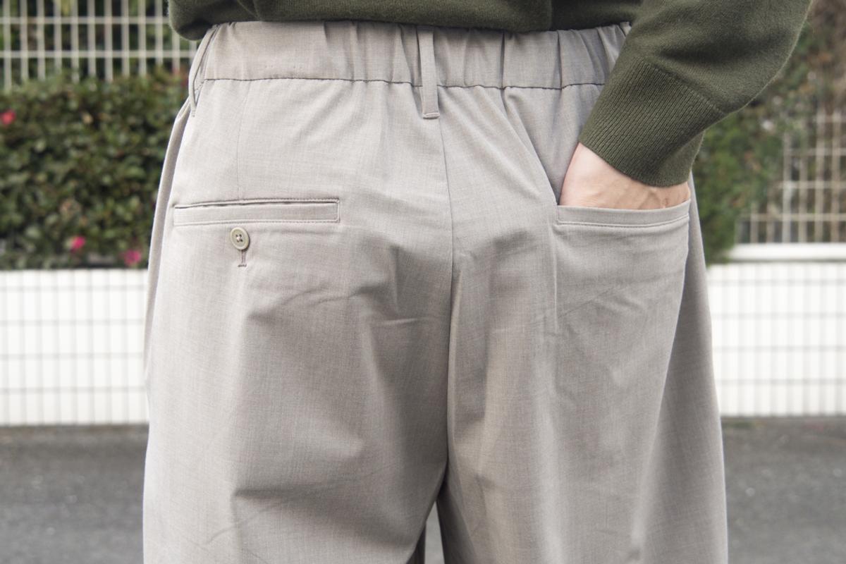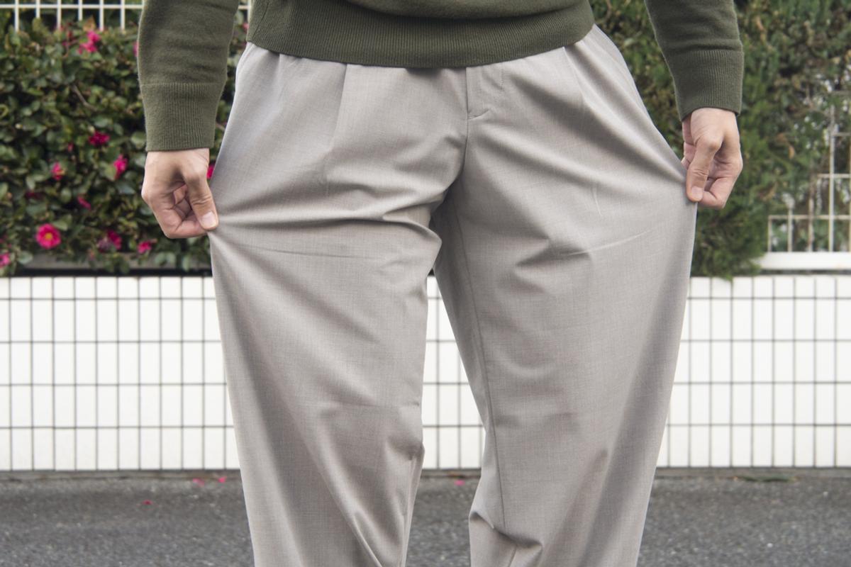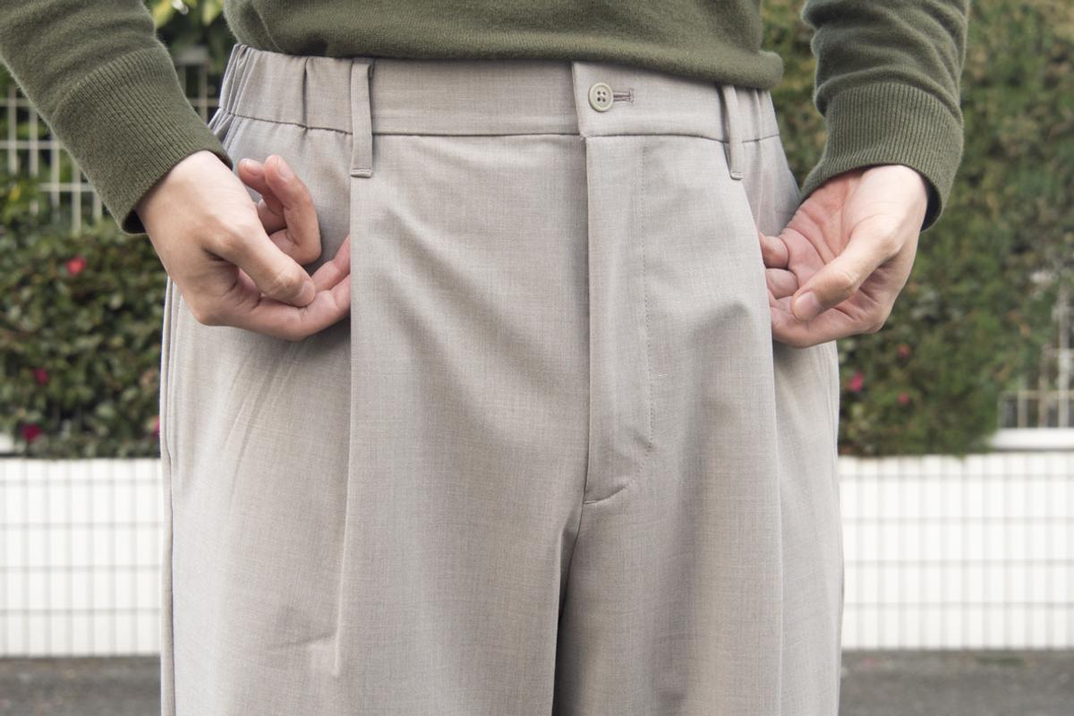 楽に穿けるパンツですが、生地の上品な印象に加えタックが入っているので、だらしない印象にならないのも嬉しいポイント。