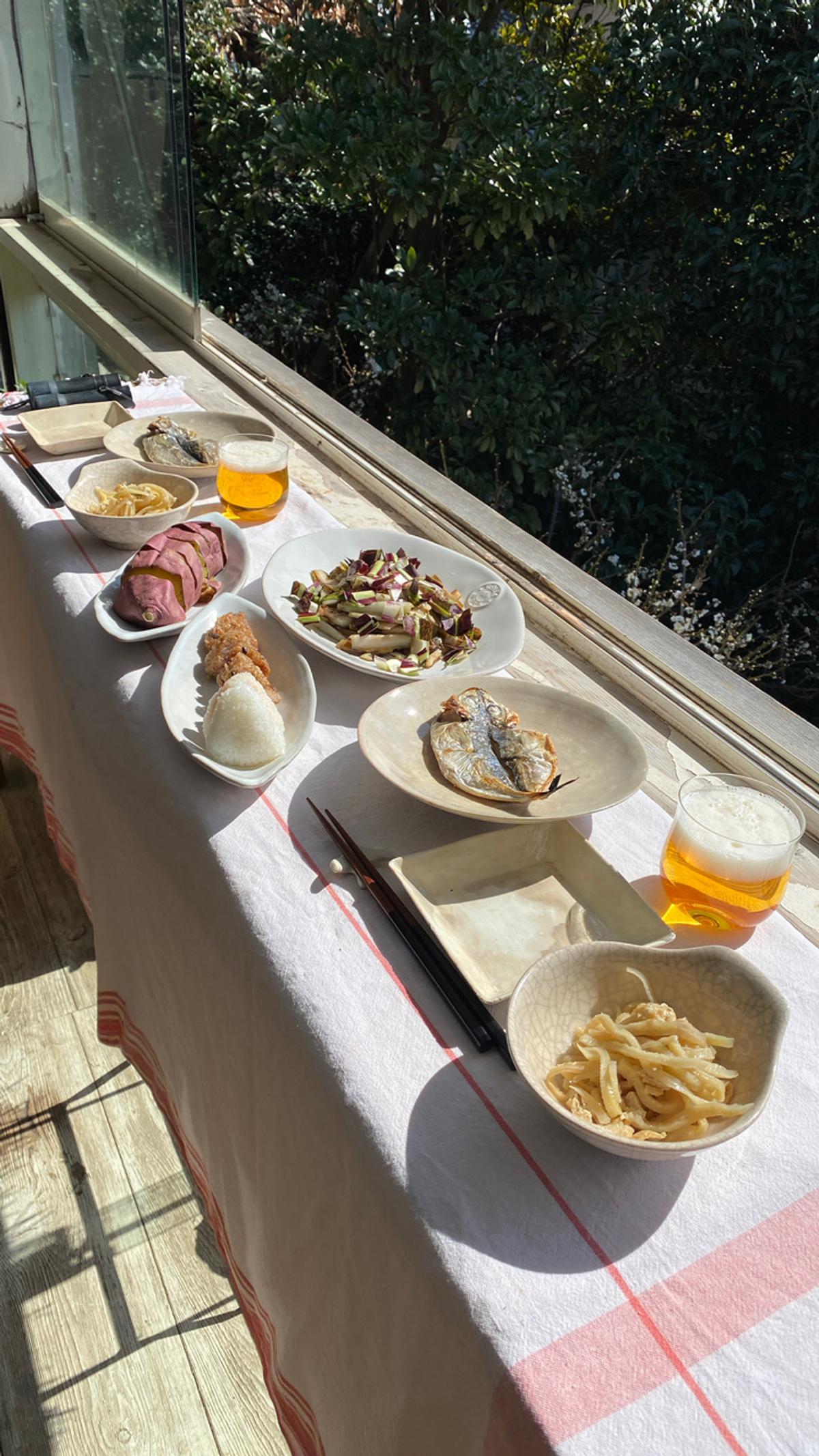 冷凍庫内にあった鯵の干物と焼きおにぎりとおにぎり。3日前にいただいた焼き芋(さつまいも)と切り干し大根と油揚げの煮物、ラディッキオと肉味噌のさっと炒め。