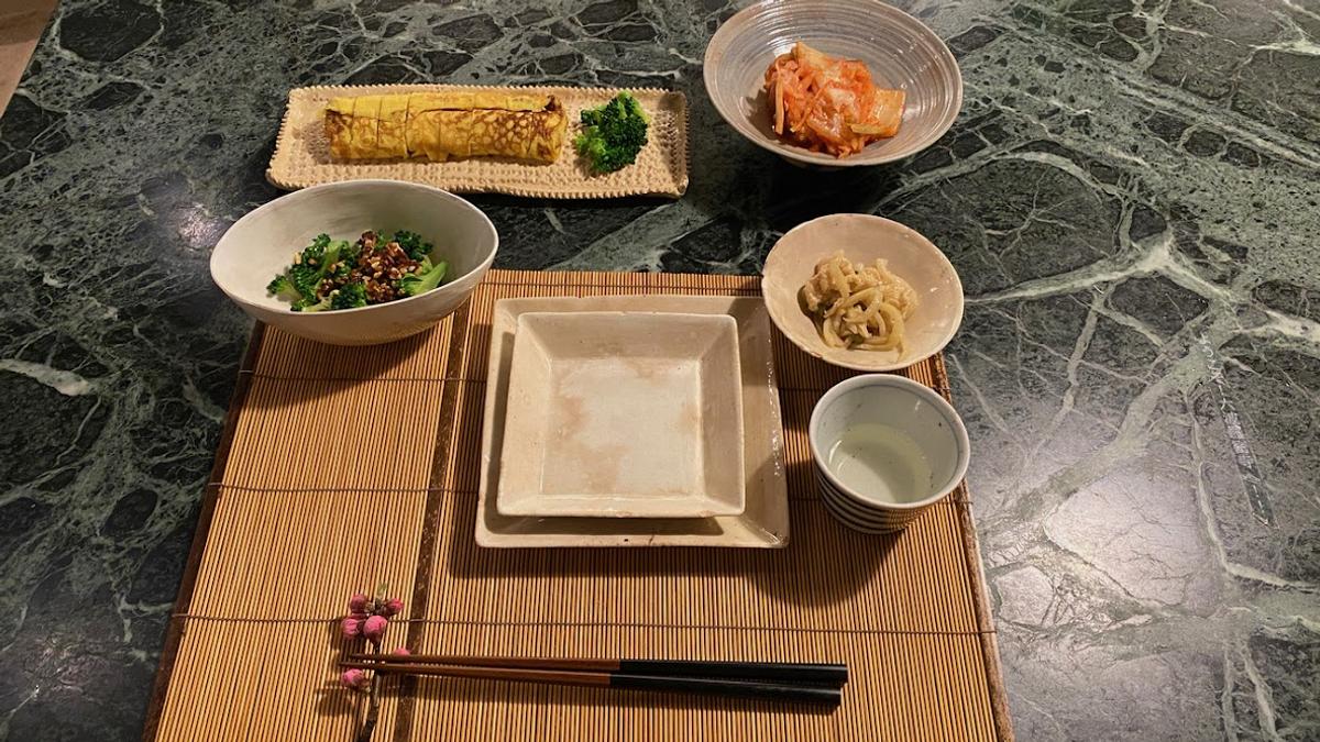 ブロッコリー(小さく切り分けて少量ずつ、10秒くらい茹でて、すぐ冷やす)と「サクサクアーモンド醤油」、だし巻き卵、