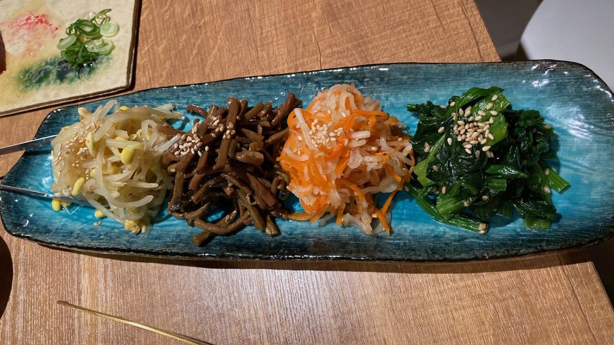 「海牛」へ行く。ナムル(もやし、わらび、にんじんと大根、ほうれん草。ナムルって美味しいね)。