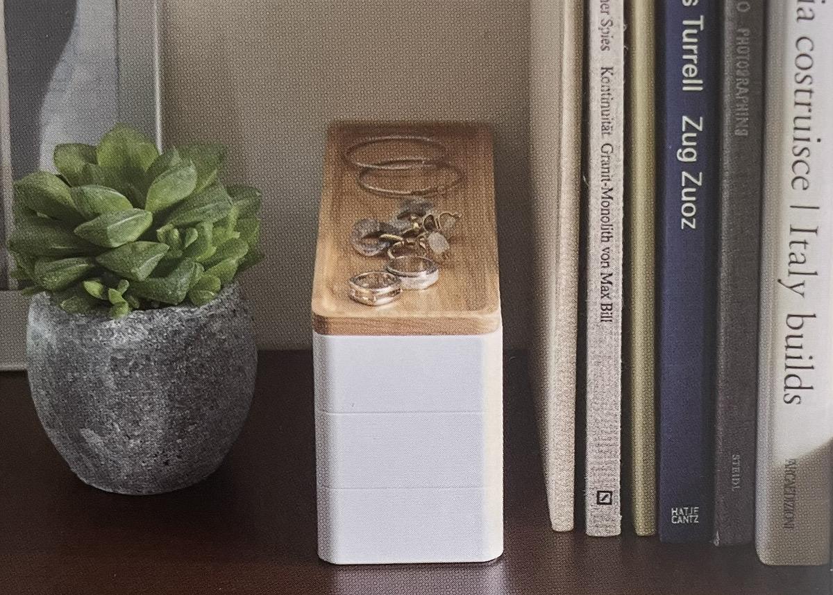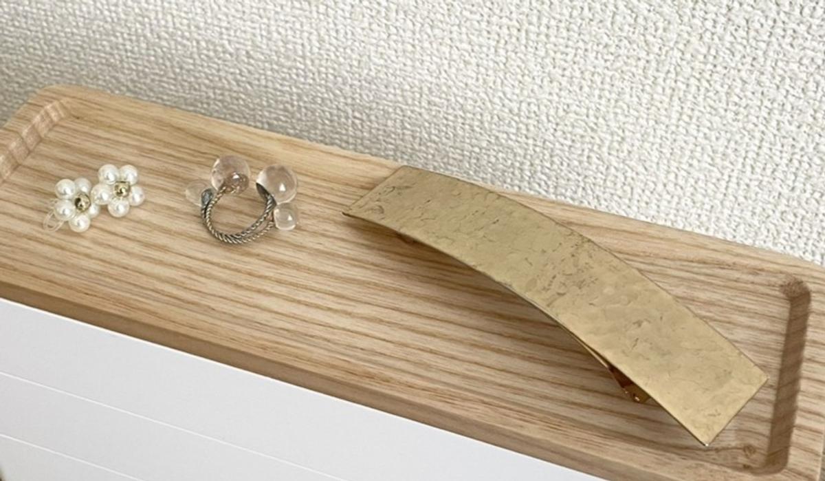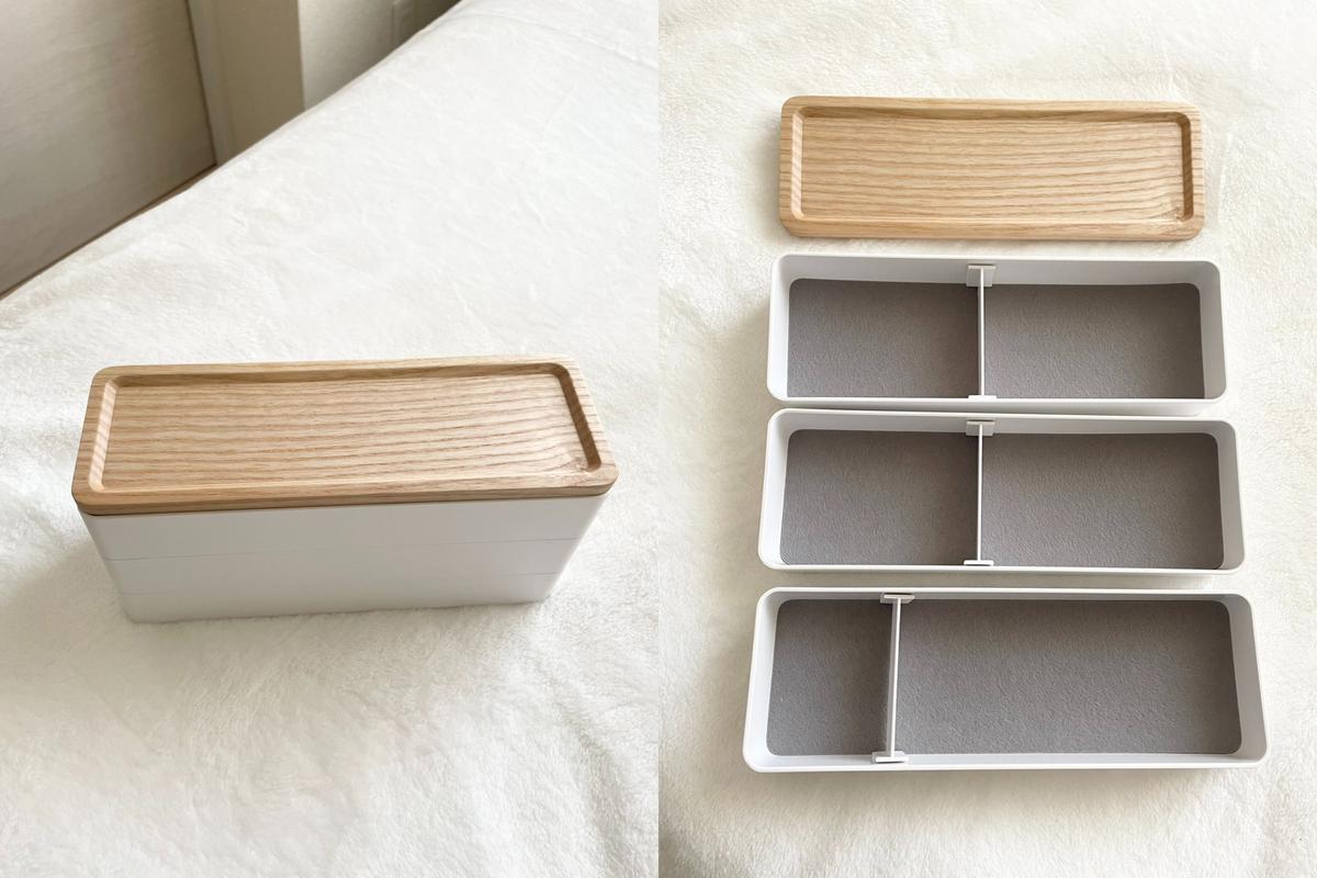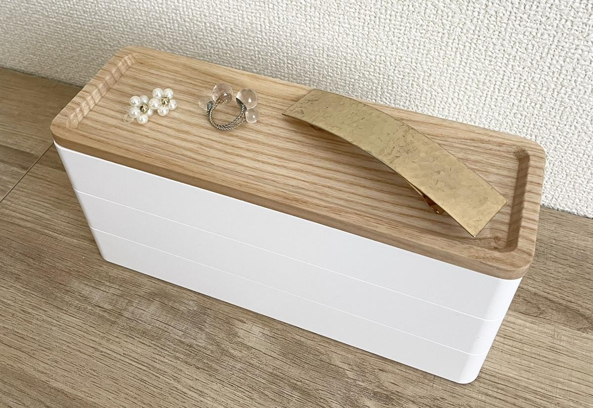 このケースに収納してから、私はお風呂上がりに、翌日使うアクセサリーを木目のトレーにのせておくようにしています。