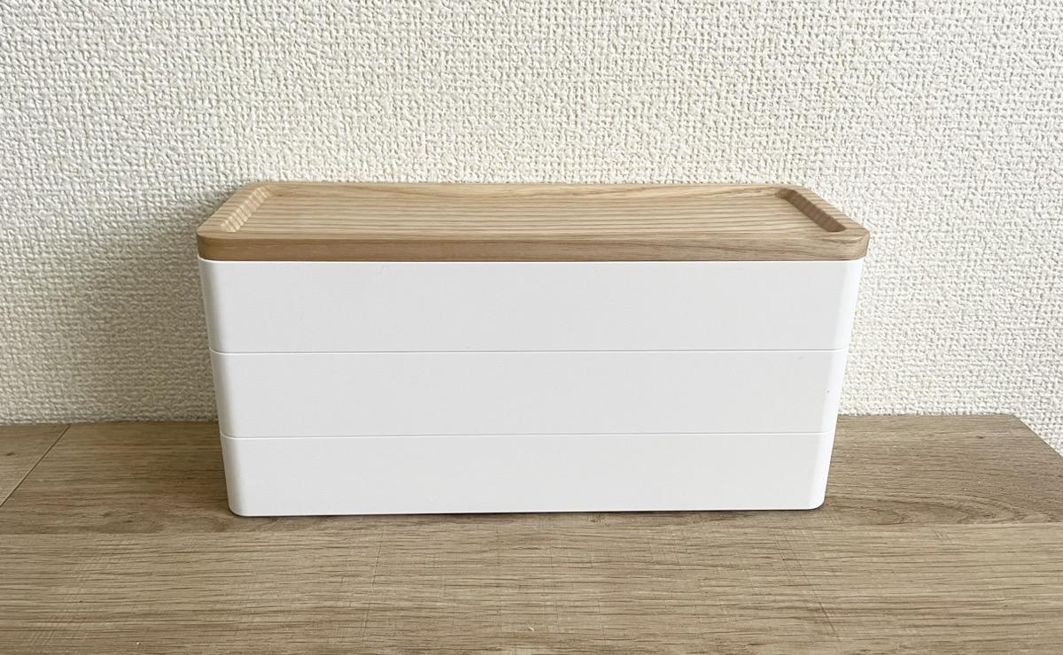 蓋と、三段のケースがついていて、ぴったり重ねたり、平置きしたりできます。