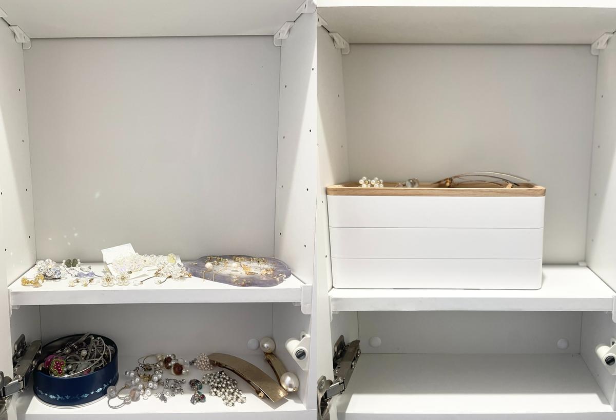 左:アクセサリーケースのみを置いた状態 右:隙間にもヘアケアやスキンケアアイテムを収納