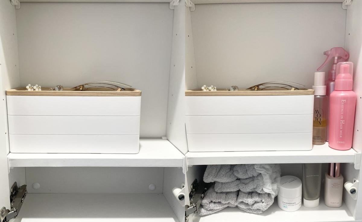 朝の準備の仕上げにアクセサリーを選ぶので、生活動線的にはここが良いのですが、この位置のまま、もう少し省スペースに収納したいなと思っていたんです。