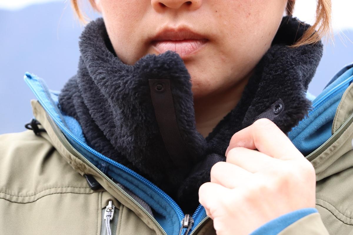モンベルのクリマエアネックウォーマーが、コンパクトで暖かいぞ。スナップで取り外しもできるから、髪型を崩さずに脱着も可能です。