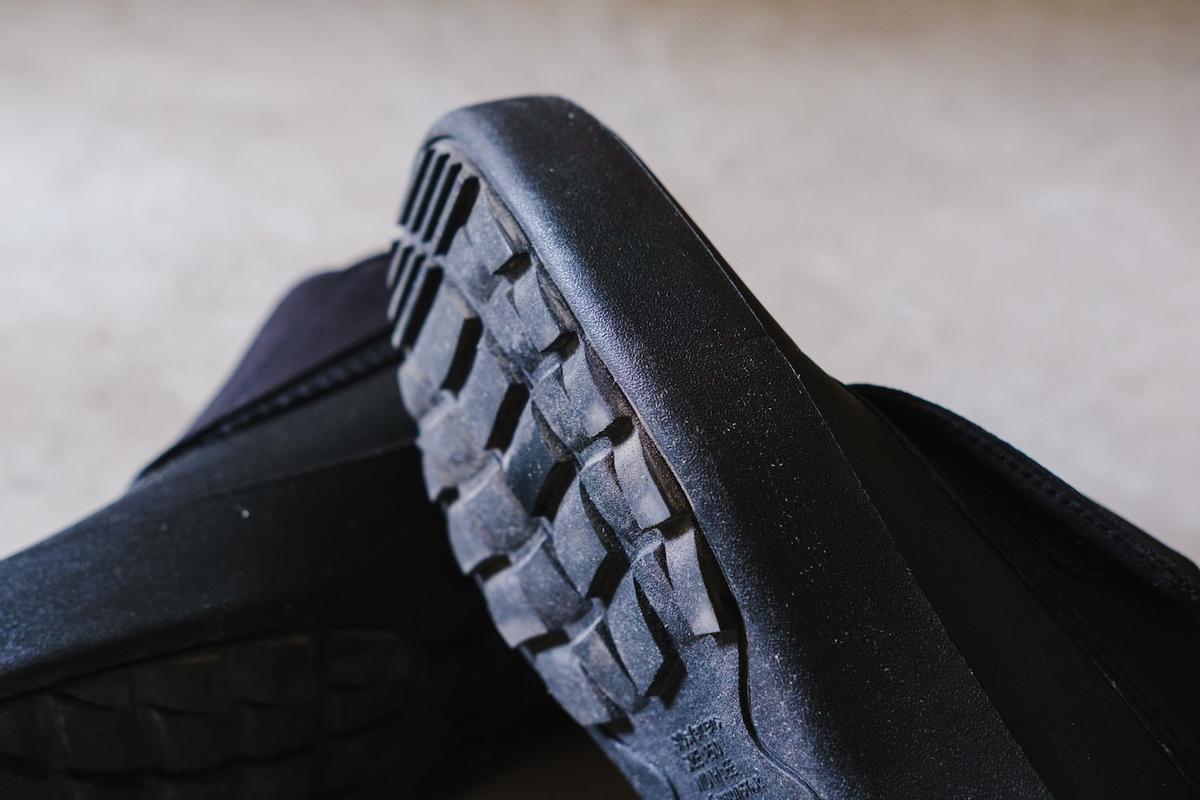 ソール部分には波形の意匠を採用。防滑性に優れていて、濡れた地面でも安心して歩けます。