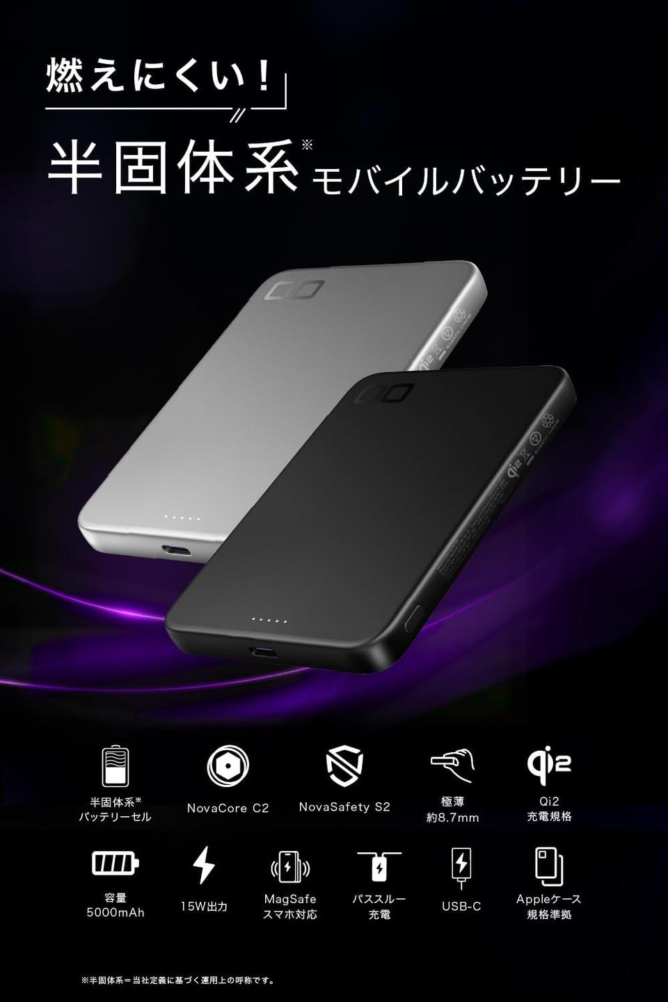 本製品の最大の特徴は、発火しにくい半固体系バッテリーセルを採用している点。加熱130℃・釘刺し・落下など過酷な試験もクリア済みで、日常使いでの安心感が段違いです。