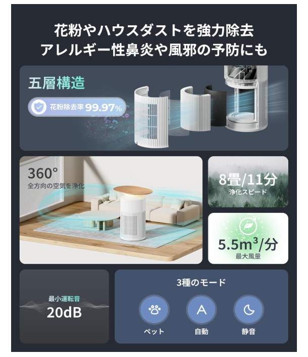 360°全方向吸引で部屋全体の空気を効率良く循環・浄化してくれるため、リビングや寝室など日常的に過ごす空間の空気を快適に保つことができます。