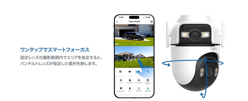 「Tapo C545D」は、一般的な首振りカメラがレンズの向いている方向しか映せないのに比べ、デュアルレンズ(1つの本体に役割が異なる2つのレンズが搭載)によって2方向同時撮影が可能。