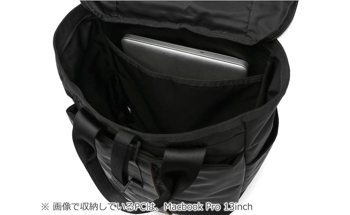 ジムで使用するウェアやタオルなどを余裕をもって収納できるメインポケットには、16インチ程度のノートPCが入るスリーブも用意されビジネスづかいもバッチリ。