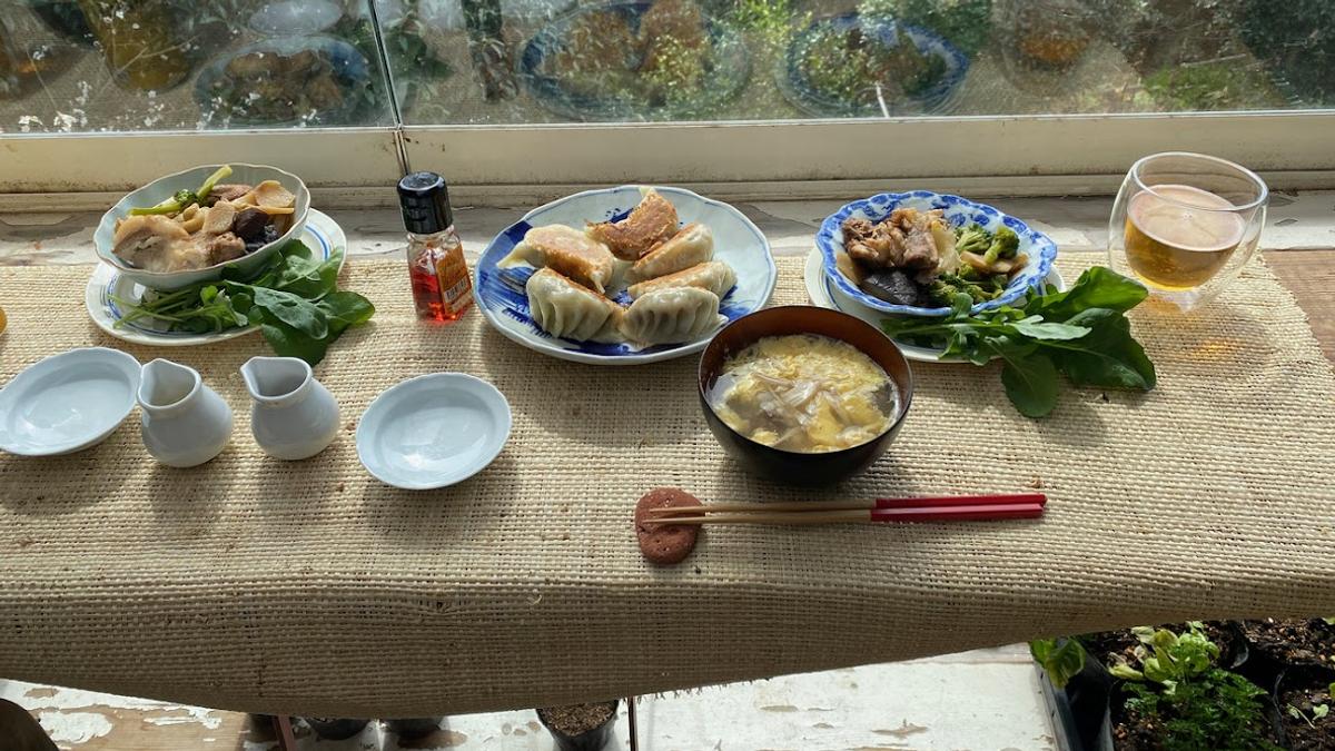 一昨日食べきれなかった豚肉の八角醤油煮を食べる。八角の香りが食欲を上げる。飛雁閣の焼き餃子、椎茸とエノキ茸の卵とじスープ。