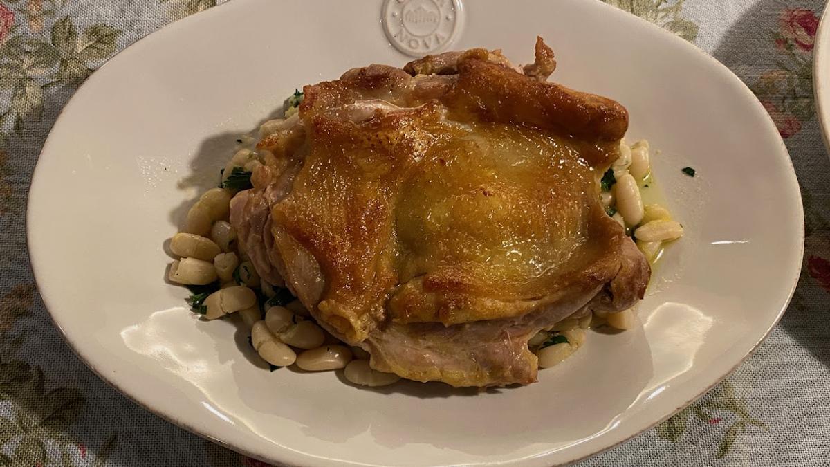 皮面をカリッと焼いた鶏肉と白インゲン豆のコンビがとってもいい感じ。とっても美味しい。どちらも味付けは塩のみ。白インゲン豆にはイタリアンパセリとレモンの皮(おろし金でおろした)が含まれているだけ。美味しかったけど、食べきれず。明日のお昼に持ち越しです。
