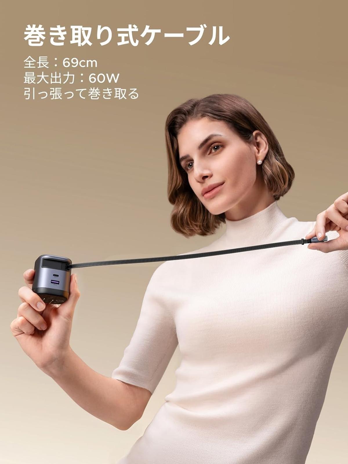 • 伸ばすだけで即充電。UGREENの巻き取りケーブル内蔵65Wが2,100円引き