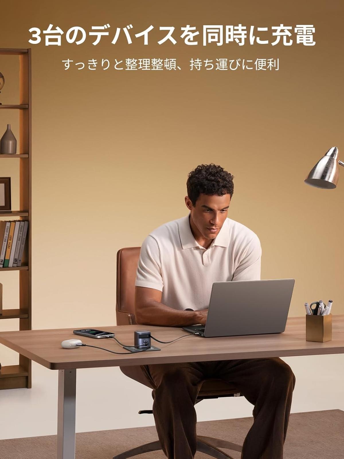 MacBook Air M4なら、約60分で84%まで充電できるほどパワフル。3ポート同時充電にも対応しており、スマートフォン・タブレット・ノートPCなどを同時に充電できます。