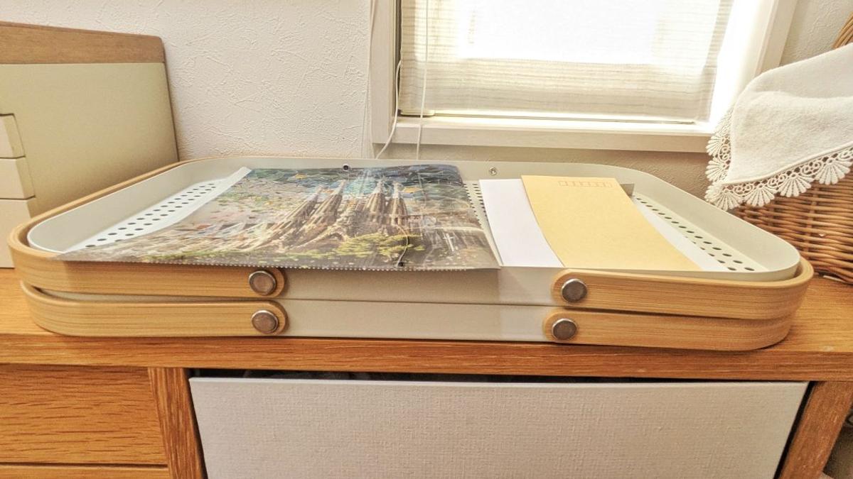 キッチンから食事を運ぶためのトレイとしてももちろん使えるのですが、私はこれをダイニングテーブル周りの書類整理に利用しています。