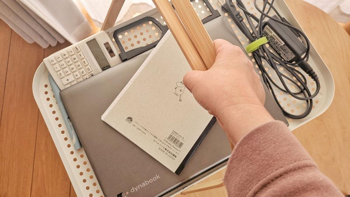 私は時々作業場所を変えるので、まとめて持ち運べるととてもラク。しかも片手で全部持てるからドアの開け閉めも問題ありません。