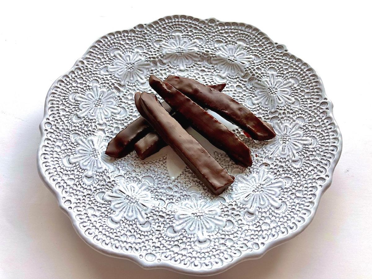 甘夏やオレンジなどの皮(ピール)の砂糖漬けに、チョコレートをコーティングした「オランジェット」。