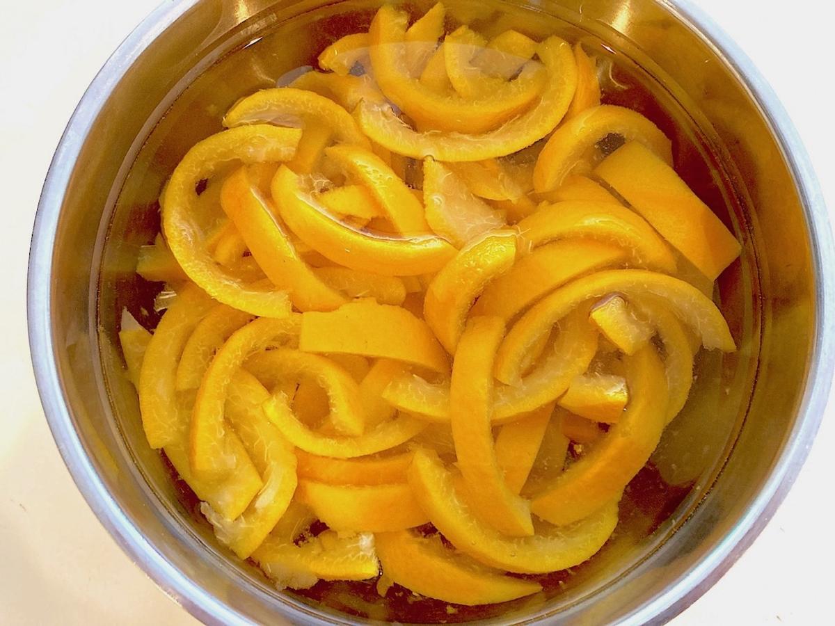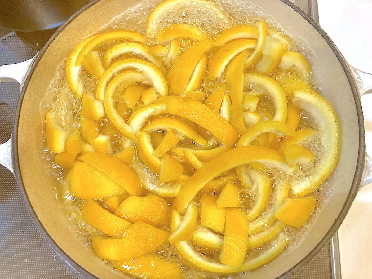 3. 皮を0.5〜1cmの細切りにして鍋に入れ、たっぷりの水を加えて沸騰させる。沸騰したら一度湯を捨て、水を換えて再び沸騰させる。この作業を2回繰り返す。