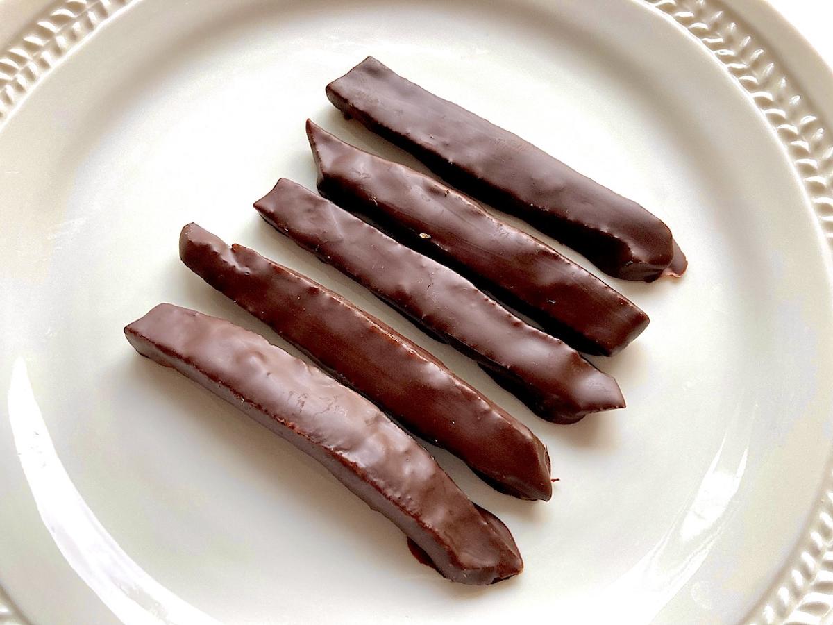 9. 火からおろしてよく冷ましたら、湯せんして溶かしたチョコレートにくぐらせて常温で固める。チョコレートは部分的につけてもOK。