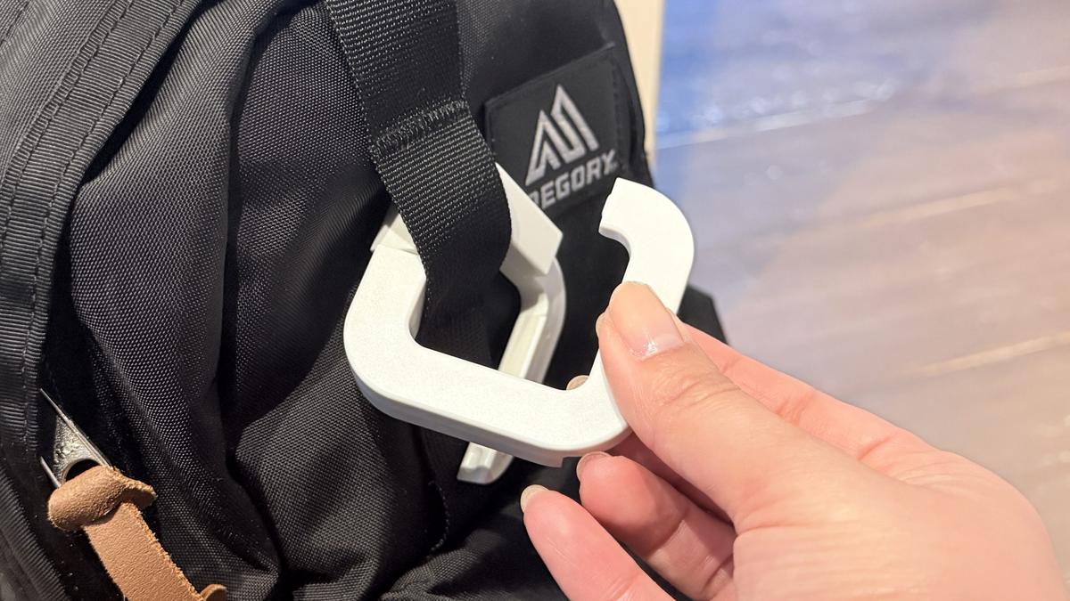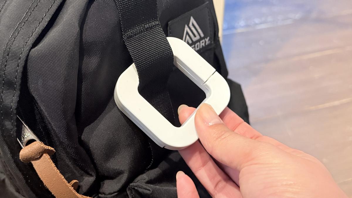 バッグハンガーって、これまでは「便利だけどけっきょく持ち歩かない」アイテムだったのですが、これはひと味違いました。バッグの持ち手などにキーホルダーのように付けっぱなしにできるので、“持っていく”ではなく“付けている”感覚で持ち運べて、とても手軽なんです。