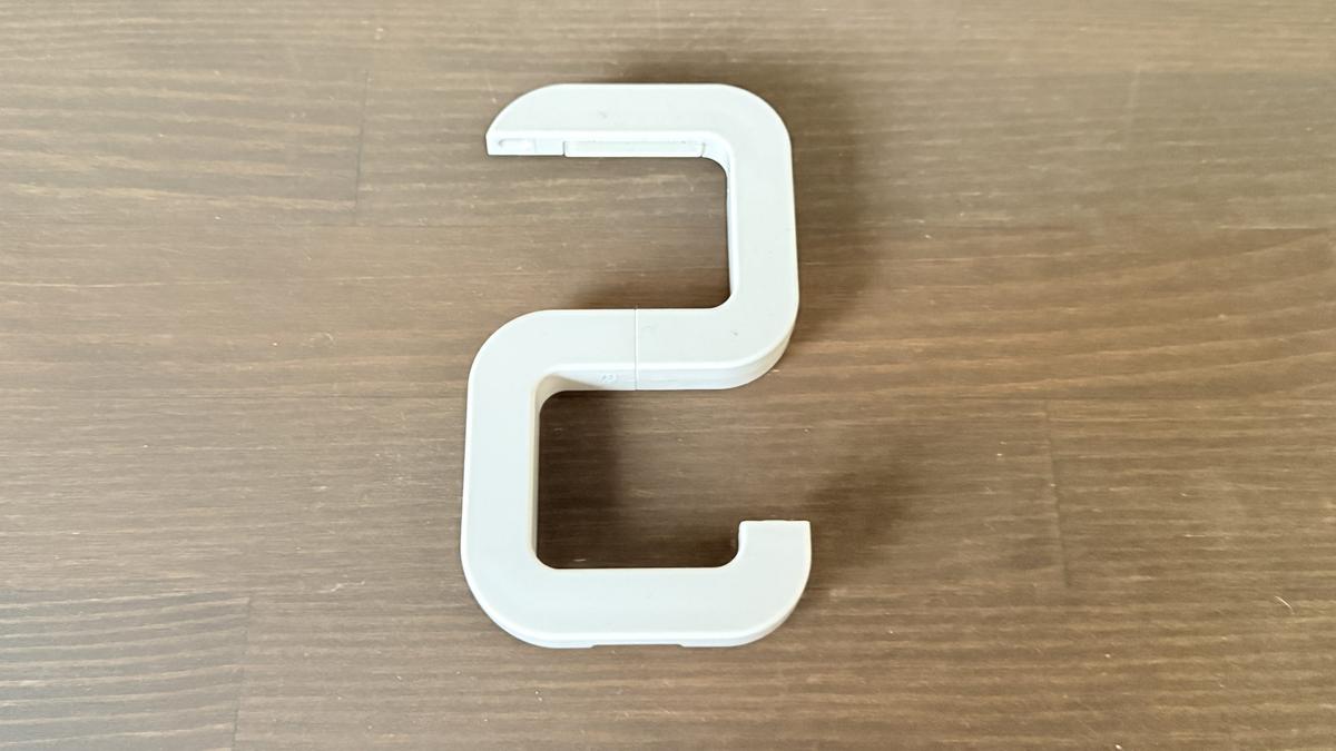これだけで、あっという間にバッグハンガーが完成します。使うときはフック状に広げ、収納時はすっきりとしたスクエア型に変形する感じが面白いし便利!