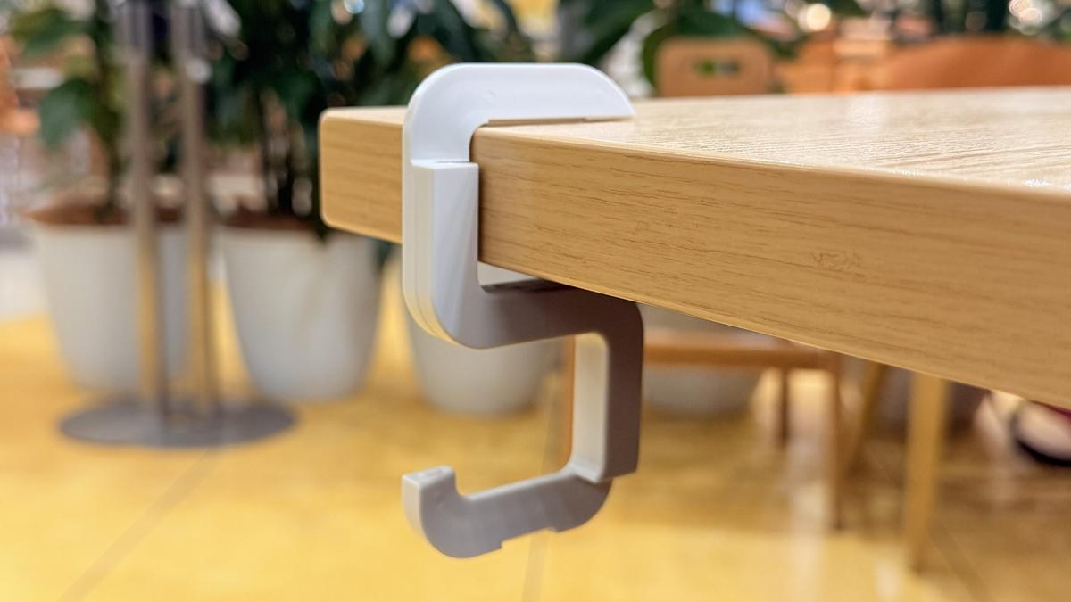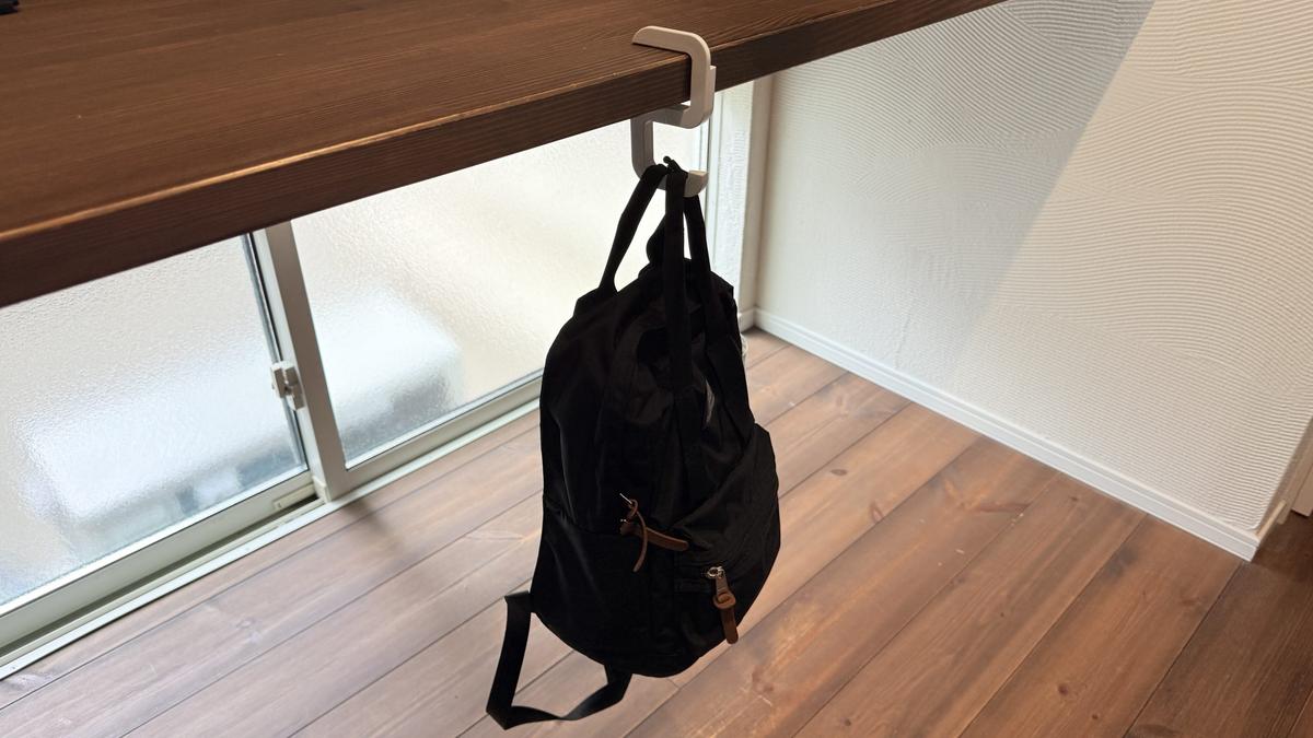 また、フックの内寸は約3.5cmあるので、一般的なテーブルなら問題なく引っ掛けられました。ただし、分厚い一枚板のような立派な天板だと入らない場合もあるので、その点だけは注意です。