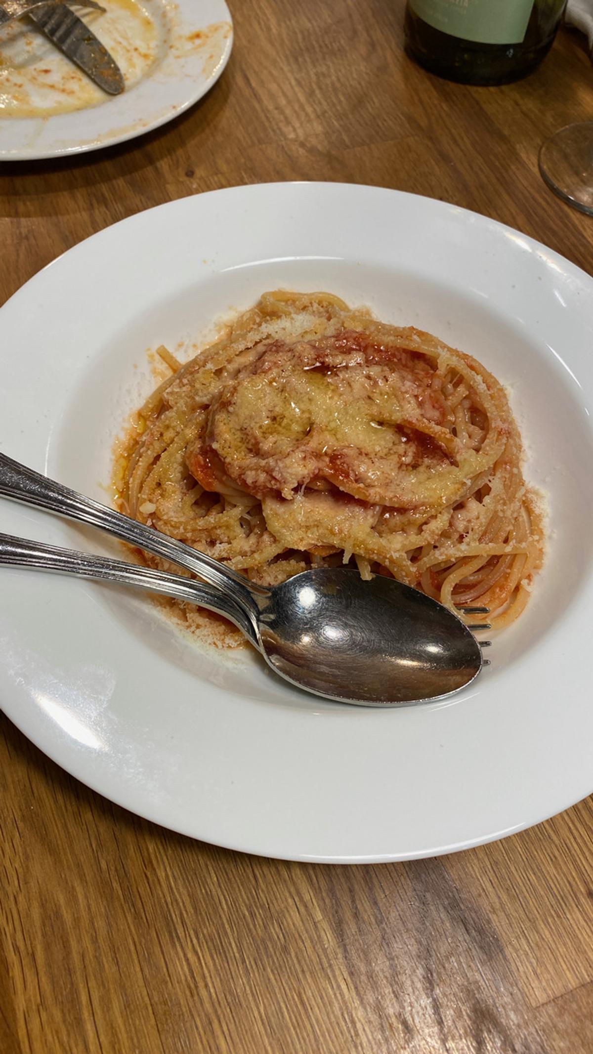 スパゲッティ・ポモドーロ。お料理全て旨し、あ~旨し。春の香りも嬉しいね。