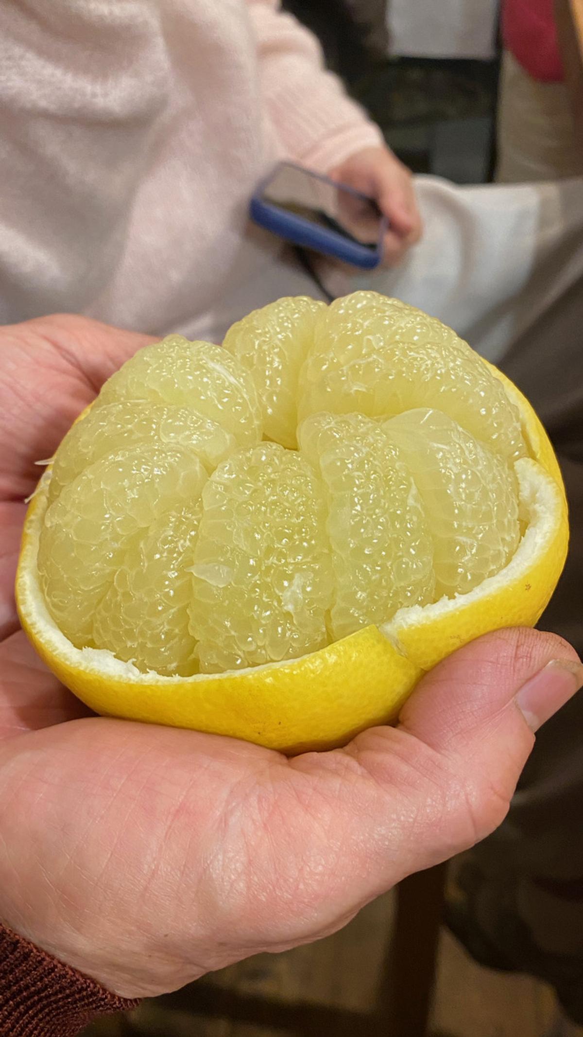 松尾さんが持ってきてくれた高知の文旦(こんなふうに丁寧にむいてきてくれました)。美味しい料理を食べながらお酒も進み(Micaちゃんは下戸)、おしゃべりも盛り上がり、Fujicoとの再会は大成功! 大人気のFujico muffin(オカラのマフィン)もいただきました。明日の朝食べます。ありがと。