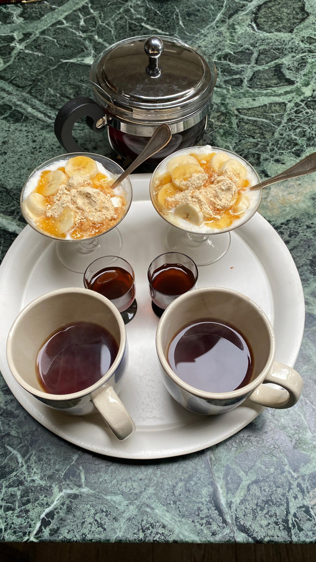 ブランチとはいえいつもの朝ごはんと同じ。単に食べる時刻が遅くなっただけです。ヨーグルトとバナナ、今日の元気、紅茶、プロテイン。