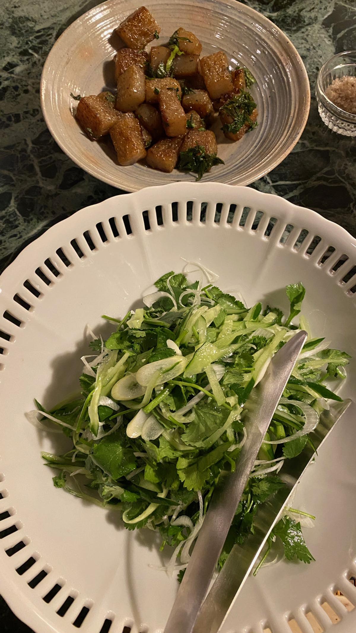 昼ごはんを食べなかったので、早めの夜ごはん。パクチーと長ネギときゅうりのサラダ(味坊レシピ)、