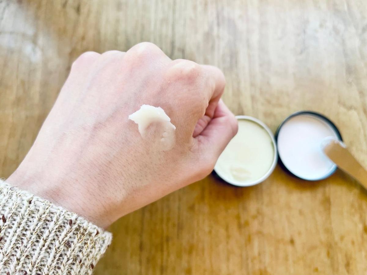 手にバームを取り、軽く押し込むようになじませると、肌の上にやわらかく広がります。